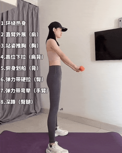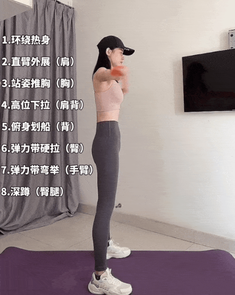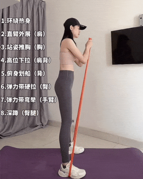 雙腳打開,與肩同寬。 彈力帶兩端握在手里。 肩膀向后,肩胛骨下沉,收腹。 雙手上舉至打直。 以「雙肘」為出發點往外下降至平行腰部。