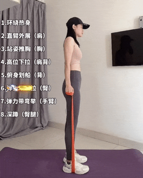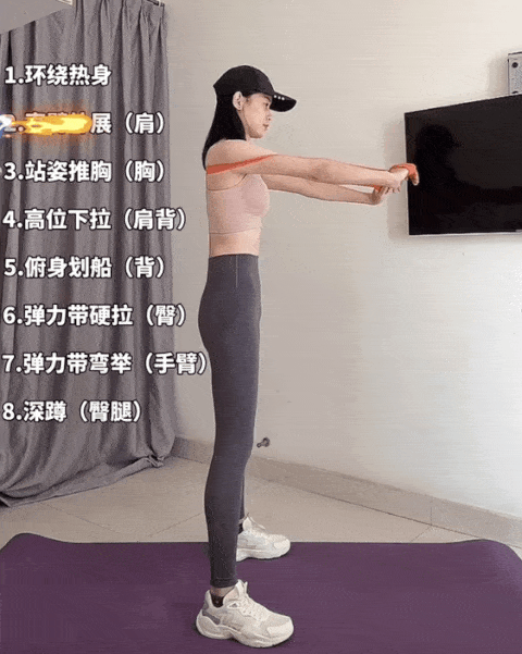雙手握住彈力帶兩端(可繞1-2圈握在手里) 雙肩下沉,不要聳肩。 雙腳打開與肩同寬。 雙臂打直,往上舉。 到最高點打直后,雙倍往后繞。 感覺肩胛骨打開,雙手下沉。 回正。