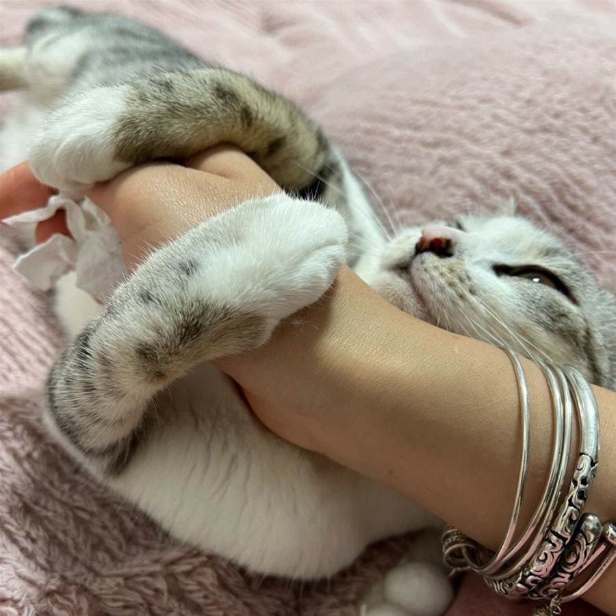 如果說你跟貓咪并不是很熟,它不怎麼信任你的時候,你忽然去摸它的肚子,或者是它一些比較敏感的地方,那它肯定會開啟防御機制。它要先發制人,所以會抱著你的手又啃又蹬,就是希望阻止你的行為。